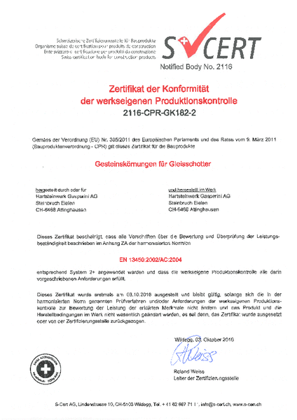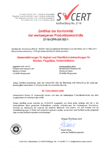Der Quarzsandstein erfüllt alle Anforderungen als Gesteinskörnung für Gleisschotter, für Asphalt und Oberflächenbehandlungen für Strassen, Flugplätze und andere Verkehrsflächen und ist entsprechend zertifiziert.